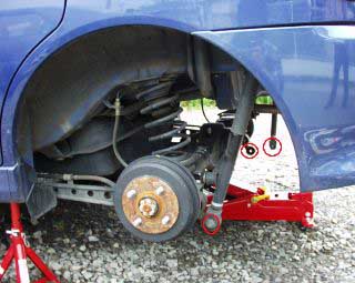 まず、デフのあたりをジャッキアップして、左右のジャッキポイントに馬をかませます。リアタイヤもはずしましょう。