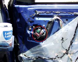 このとき、まだミラー内側カバーはドアにつけません。ロータリーユニットを動かすと、配線が伸び縮みしますので、その分の余裕をもたせて、ドア側の防水シートと粘着剤(手などにつくとなかなかとれません!ご注意を)で固定しちゃいます。