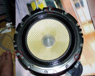 クロスオーバーネットワークのウーファー出力を、ウーファーに接続したのち、純正スピーカー位置にウーファーを固定するのですが・・・ここで、なかばやしさんと同現象がでました・・・スピーカー(正確には、スピーカーブラケット)が小さい!!ということです。